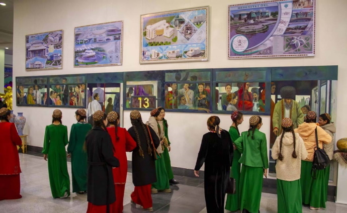 В Государственной Академии художеств Туркменистана проходит отчетная выставка работ студентов и преподавателей вуза. Об этом сообщает электронная газета «Туркменистан: Золотой век». На картинах художников запечатлены сцены из жизни Академии, лица преподавателей и студентов, известных деятелей искусств. Самой примечательной работой является «Остановка» Айны Атамурадовой, изображающая один из городских автобусов с пассажирами в натуральную величину. В качестве некоторых моделей для картины ее автору послужили сами студенты, обучающиеся в вузе и приезжающие на учебу именно на этом транспорте. Экспонаты выставки выполнены в жанрах плаката, натюрморта, панно. Представлены также украшения для лошадей, туркменские ковры, книги, посвященные творчеству туркменских художников. В рамках мероприятия состоялся показ коллекции одежды дизайнера Дженнет Агаевой. Модели, выполненные из бархата и шелка и богато украшенные ручной национальной вышивкой, привлекли всеобщее внимание.