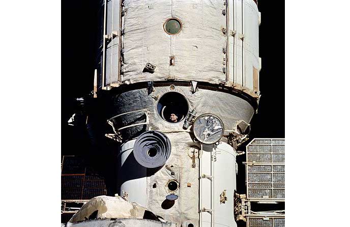 Suratda: Kosmonawt Waleriý Polýakow “Mir” kosmos bekedinden amerikan gämisiniň birikdirilişine syn edýär.