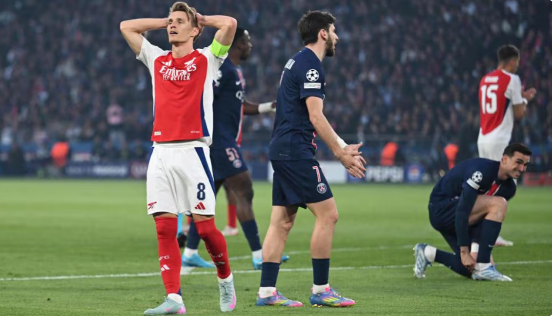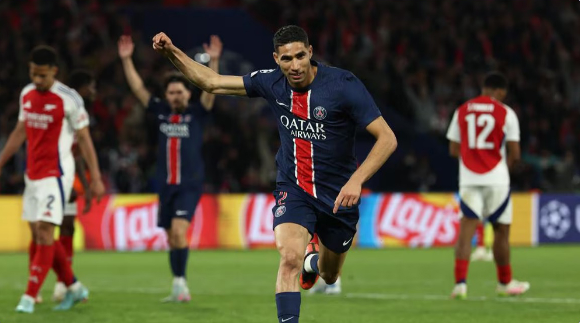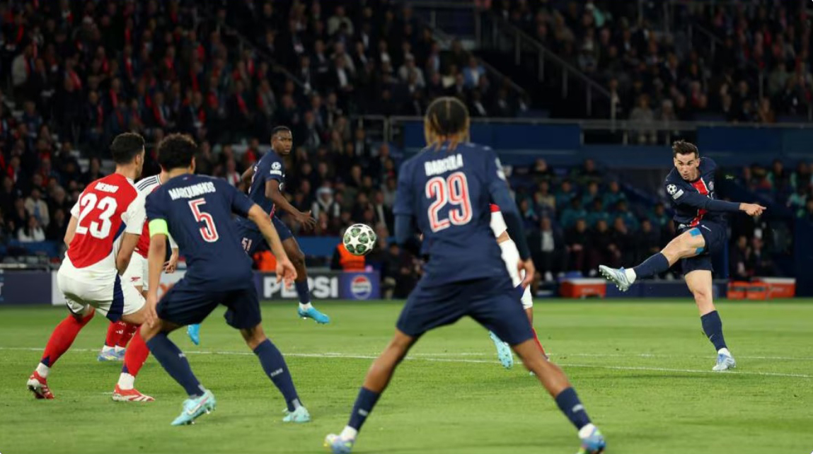 Geçen hepdäniň sişenbe güni Londondan ýeňiş bilen dolanan “Pari Sen-Žermen” topary üçin öz meýdançasyndaky duşuşygyň ýeňil geçmejekdigi bellidi. Duşuşyk “Arsenalyň” yzygiderli hüjümleri bilen başlandy. Ýöne parižlileriň italýan derwezeçisi Janluiji Donnarummany geçmek iňlis klubunyň oýunçylaryna başartmady. Aýratynam Martinelliniň, Edegoryň urgularynda italiýaly derwezeçi öz ussatlygyny görkezdi. Duşuşygyň 17-nji minutynda garşylyklaýyn hüjümde ýer eýelerinden Hwiça Kwarasheliýanyň urgusy sütünden yzyna gaýtdy. Kem-kemden oýna şärik bolup başlan PSŽ 27-nji minutda Fabian Ruiziň ajaýyp goly bilen öňe saýlandy. Duşuşygyň 1-nji ýarymy şol hasap bilen tamamlandy.