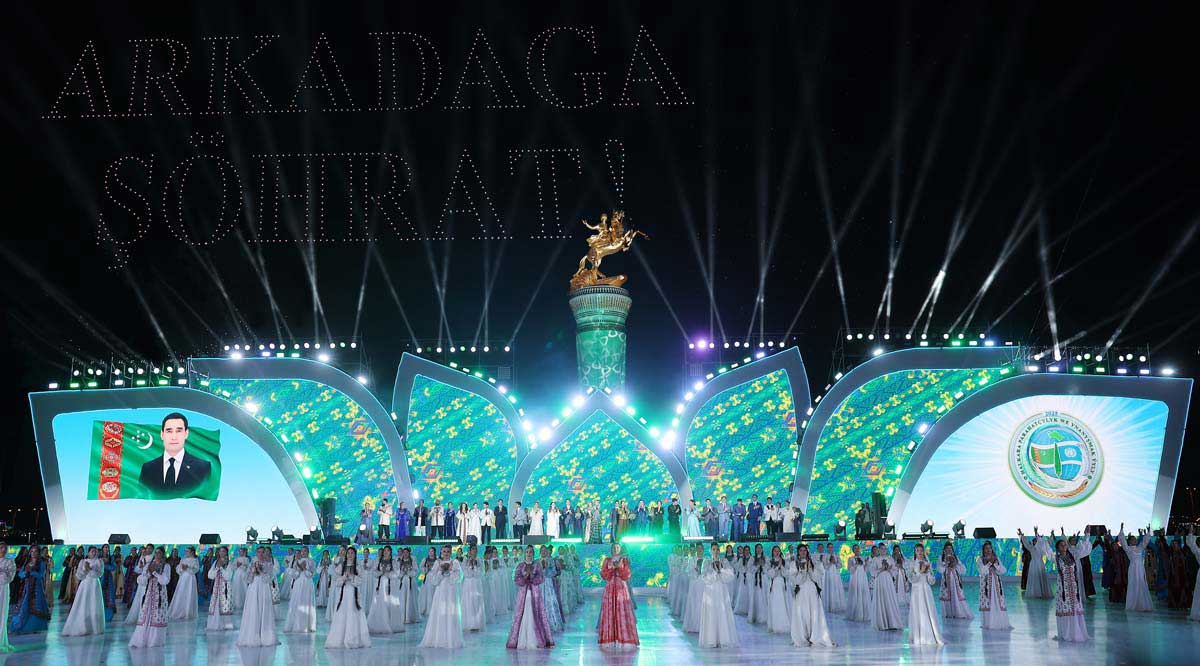 Soňra Maýa Kulyýewa adyndaky Türkmen milli konserwatoriýasynyň horunyň, Arkadag şäheriniň we ýurdumyzyň birleşen döredijilik toparlarynyň gatnaşmagynda «Gahryman Arkadagymyz — halkyň ykbalyna nur-çyragymyz» atly edebi-sazly kompozisiýa ýerine ýetirildi. Artistler öňdengörüjilikli syýasaty bilen ýurdumyzda parahatçylygyň we ylalaşygyň berk binýadyny goýan Milli Liderimiziň beýik işlerini wasp etdiler. Arkadag şäheriniň körpe aýdymçylarynyň, «Mukam» skripkaçylar toparynyň, «Şowhun», «Şatlyk», «Ruhubelent çagalar» tans toparlarynyň ýerine ýetiren «Biz bagtyň gujagynda» atly kompozisiýada türkmen halkynyň baý döredijiligi öz beýanyny tapdy.