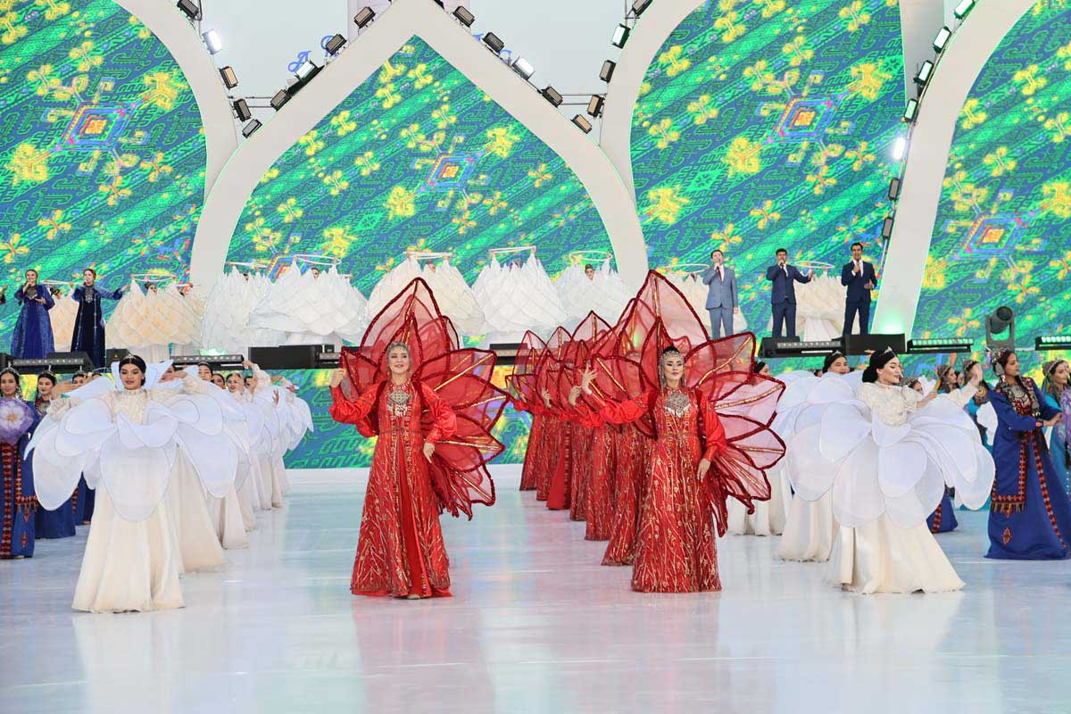 Проникновенное погружение в богатство народного творчества подарили юные таланты из детских фольклорных групп «Şowhun», «Şatlyk», «Ruhubelent çagalar», города Аркадаг и ансамбль скрипачей «Mukam». Чистое звучание и искренность трогательной композиции «Biz bagtyň gujagynda» наполнили пространство радостью, передавая всю красоту и самобытность национального фольклора.
