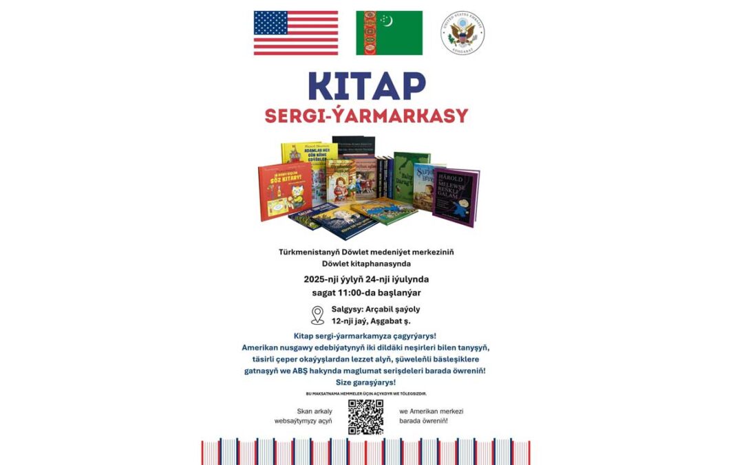 24-nji iýulda sagat 11:00-da Türkmenistanyň Döwlet medeniýet merkeziniň Döwlet kitaphanasynda kitap sergi-ýarmarkasy geçiriler. Bu kitap sergisi ABŞ-nyň Türkmenistandaky Ilçihanasy we Türkmenistanyň Hökümeti bilen bilelikde guralýar. Serginiň myhmanlary amerikan nusgawy edebiýatynyň iki dildäki neşirleri bilen tanyşmaga, täsirli çeper okaýyşlary diňlemäge, şüweleňli bäsleşiklere gatnaşmaga we ABŞ hakynda maglumat serişdelerini öwrenmäge mümkinçilik alarlar.
