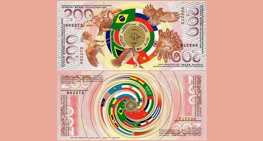 BRICS-iň simwoliki banknoty ilkinji gezek 2024-nji ýylyň oktýabr aýynda görkezildi. 2025-nji ýylda Sankt-Peterburg halkara ykdysady forumynda 200 nominal bilen täze simwoliki “BRICS-iň banknoty” hödürlendi. Onuň bir tarapynda blogy esaslandyryjy ýurtlarda ýaşaýan (Russiýa, Braziliýa, Hindistan, Hytaý we Günorta Afrika) guşlar, beýleki tarapynda bolsa bileleşigiň agza döwletleriniň baýdaklary şekillendirilýär.