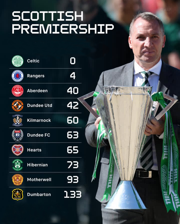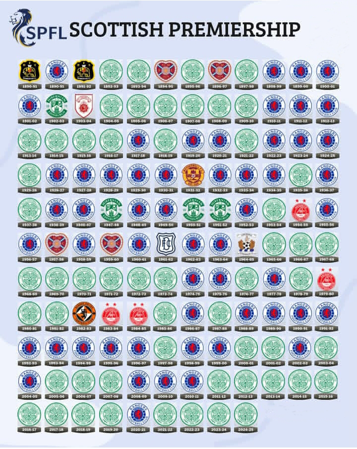 Şu wagta çenli çempionatda näçe klubuň oýnandygy anyk bilinmese-de, çempionlyk gazanan klublaryň sany 11-e deňdir. 128 möwsümi yzda galdyran çempionatyň 110 möwsüminde diňe 2 topar çempionlyk gazanýar. Ýagny “Seltik” bilen “Reýnjers” klublarynyň hersiniň 55 çempionlygy bolup, olar bu ugurda dünýäde 2-nji orny paýlaşýarlar. 1-nji ýerde Demirgazyk Irlandiýanyň “Linfild” topary bolup, onuň 57 çempionlygy bar. Glazgo şäheriniň 2 wekili diňe 2 gezek yzly-yzyna 2 möwsümde hem-de 1 gezek yzly-yzyna 3 möwsümde çempionlyk gazanyp bilmeýär. Ýogsam her ýyl diýen ýaly çempionlyk kubogy glazgolylaryň ellerinde ýokary göterilýär. Olaryň çempionlyk gazanyp bilmedik bassyr 3 ýyly diňe 1980-nji ýyllaryň başlarynda hasaba alynýar. 1983-84-85-nji ýyllarda Glazgo şäheriniň 2 kluby çempion bolmaýar. Mundan başga-da bu 2 klubdan haýsy hem bolsa biri 2 döwürde yzly-yzyna 2 möwsümi çempion bolup bilmeýär (1902/03 – 1903/04, 1950/51 – 1951/52).