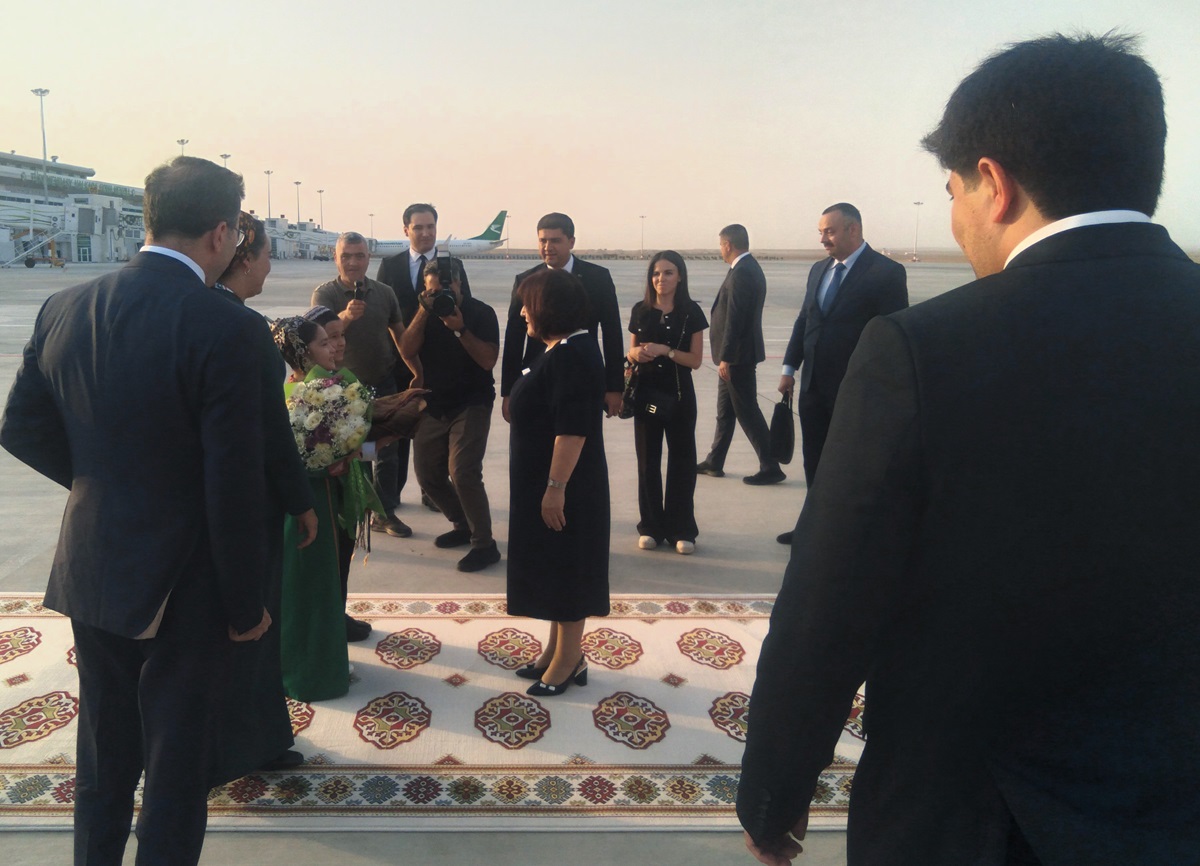 Hormatly myhmanyň uçary Türkmenbaşy Halkara howa menziline gondy. Sahiba Gafarowa bu ýerde türkmen milli däplerine laýyklykda mähirli garşylandy.