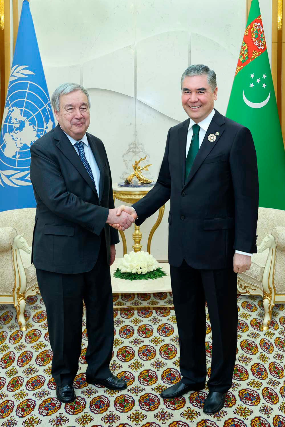 Belent mertebeli myhman Türkmenbaşy Halkara howa menzilinde mähirli garşylandy. Asylly däbe görä, oňa gül desseleri gowşurylyp, duz-çörek hödür edildi. Türkmen halkynyň Milli Lideri, Türkmenistanyň Halk Maslahatynyň Başlygy Gurbanguly Berdimuhamedow BMG-niň Baş sekretary bilen mähirli salamlaşyp, ony mukaddes türkmen topragynda görýändigine şatdygyny aýtdy.
