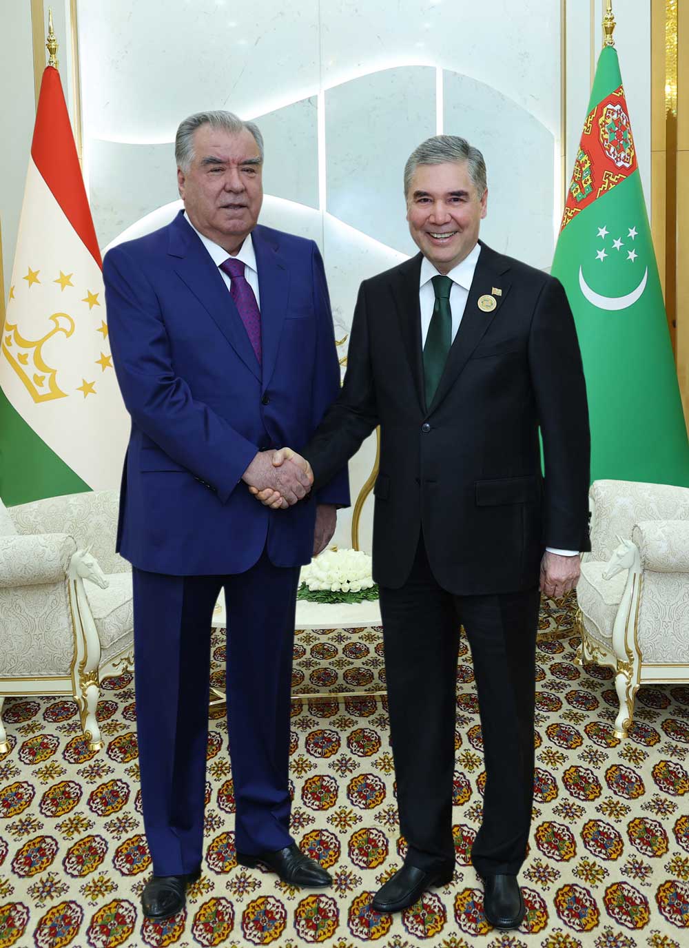 Türkmen halkynyň Milli Lideri, Türkmenistanyň Halk Maslahatynyň Başlygy Gurbanguly Berdimuhamedow we Täjigistan Respublikasynyň Prezidenti Emomali Rahmon soňky ýyllarda iki ýurduň arasyndaky hoşniýetli goňşuçylyk gatnaşyklarynyň işjeň ösdürilýändigini kanagatlanma bilen bellediler. Gahryman Arkadagymyz we dostlukly döwletiň Baştutany maslahatyň çäklerinde garaljak meseleleriň özara hyzmatdaşlygyň mundan beýläk-de ilerledilmegine kuwwatly itergi berjekdigine ynam bildirdiler.