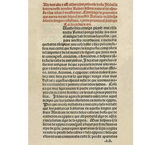 1492-nji ýylyň 18-nji awgustynda ispan diliniň ilkinji grammatikasy baradaky kitap Kastiliýanyň we Leonyň Şa Zenany Izabella I-e sowgat berilýär. Kastiliýa diliniň grammatikasy (“Gramática de la lengua castellana”) atly kitaby Antonio de Nebriha ýazýar. Bu kitap ispan dili we onuň kadalary bilen bagly hem-de Ýewropa dillerinde çykarylan çap edilen ilkinji iş hasaplanýar. Dilçi, leksikograf, taryhçy, pedagog bolan Nebriha 1495-nji ispan dilindäki ilkinji sözlügi hem çykarýar.