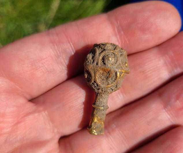 The gold object, which dates back to the 800s, is approximately one and a half inches long and has a decorative ornament on one end.