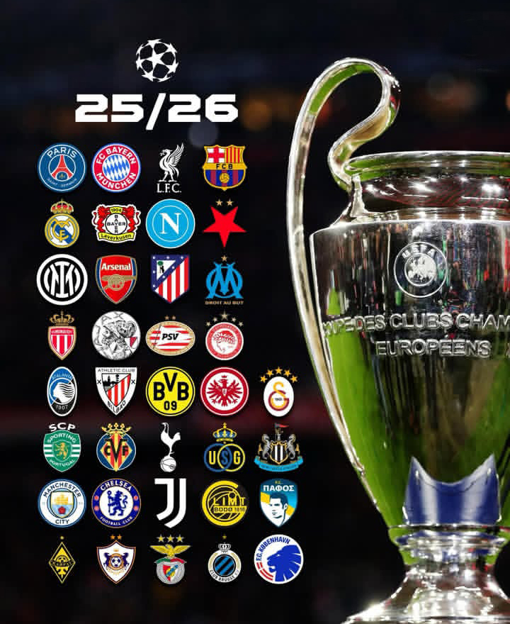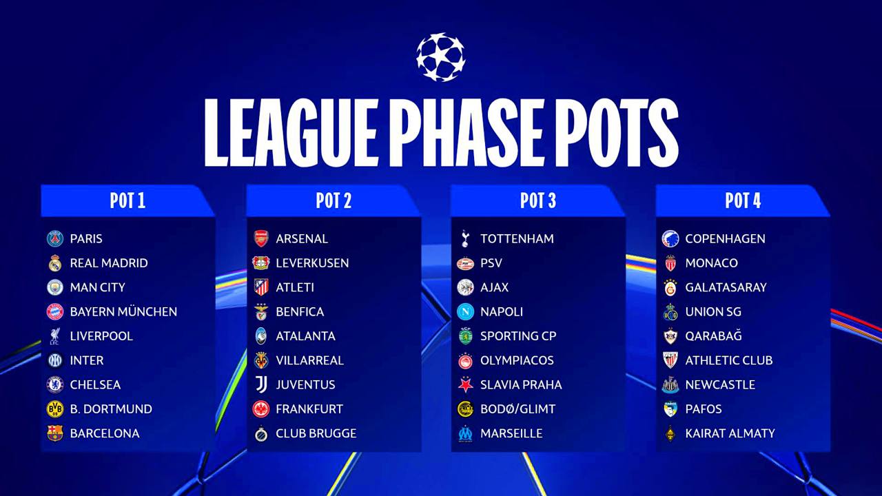 1-nji torba Pari Sen Žermen (Fransiýa) Real Madrid (Ispaniýa) Mançester Siti (Angliýa) Bawariýa (Germaniýa) Liwerpul (Angliýa) Inter (Italiýa) Çelsi (Angliýa) Borussiýa Dortmund (Germaniýa) Barselona (Ispaniýa) 2-nji torba Arsenal (Angliýa) Baýer (Germaniýa) Atletiko Madrid (Ispaniýa) Benfika (Portugaliýa) Atalanta (Italiýa) Wilýarreal (Ispaniýa) Ýuwentus (Italiýa) Aýntraht (Germaniýa) Klub Brýugge (Belgiýa) 3-nji torba Tottenham (Angliýa) PSW (Niderlandlar) Aýaks (Niderlandlar) Napoli (Italiýa) Sporting (Portugaliýa) Olimpiakos (Gresiýa) Slawiýa Praga (Çehiýa) Bude-Glimt (Norwegiýa) Marsel (Fransiýa) 4-nji torba Kopengagen (Daniýa) Monako (Fransiýa) Galatasaraý (Türkiýe) Ýunion Sent-Žilluaz (Belgiýa) Garabag (Azerbaýjan) Atletik Bilbao (Ispaniýa) Nýukasl (Angliýa) Pafos (Kipr) Kairat (Gazagystan)