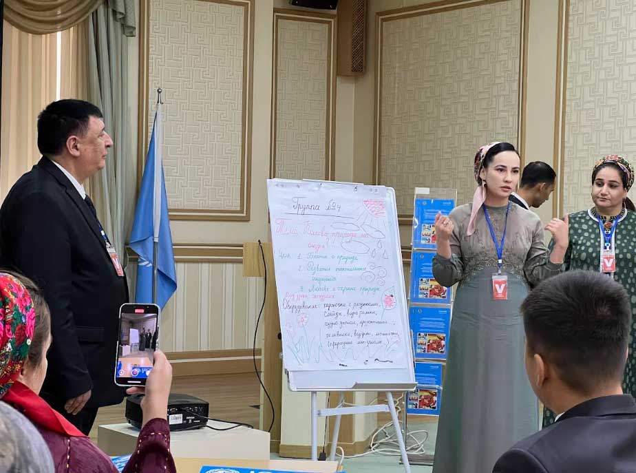 The presentation of the program brought together 36 specialists from the Ministry of Education, the National Institute of Education, universities, teacher training colleges and kindergartens from all velayats, the cities of Ashgabat and Arkadag. The participants took part in interactive sessions, discussed the practical application of the manual and tested game activities. A symbolic moment was the ceremonial presentation of a new methodological manual on adaptation to climate change and disaster risk reduction to the Ministry of Education.