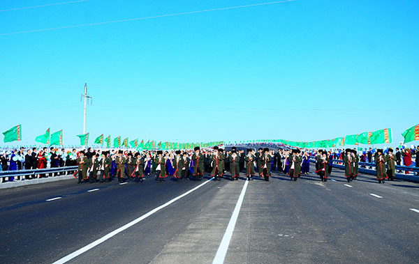 Dabara gatnaşyjylaryň şowhunly el çarpyşmalary bilen täze köprülerden ilkinji awtoulaglar geçip başlady. Awtoulaglaryň iki tarapa hem bökdençsiz hereket edilen üpjün edilen döwrebap köprüleriň ugrunda germewler, yşyklandyryş ulgamlary çekilipdir.