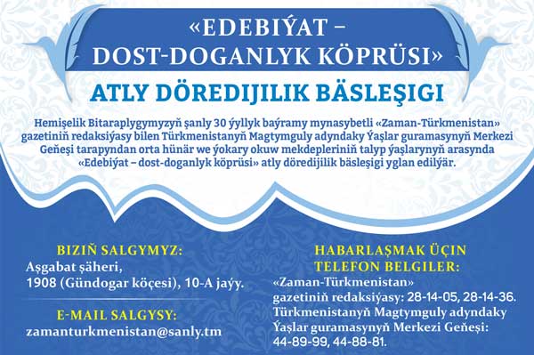 In order to identify talented youth, the editorial office of the newspaper “Zaman-Turkmenistan” in honor of the 30th anniversary of our permanent Neutrality, together with the Central Council of the Youth Organization of Turkmenistan named after Magtymguly, announces an art competition among students of our country engaged in creativity called “Literature – a bridge of friendship and brotherhood”.