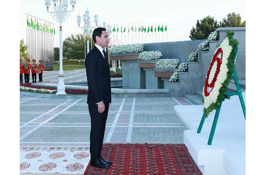 Döwlet Baştutanymyz bellenilen ýere geçýär. Harby orkestriň ýerine ýetirmeginde Türkmenistanyň Döwlet senasy ýaňlanýar. Soňra Arkadagly Gahryman Serdarymyz ýurdumyzyň döwlet berkararlygynyň we özygtyýarlylygynyň nyşany bolan Garaşsyzlyk binasyna gül desselerini goýdy. Hormatly Prezidentimiziň göreldesine eýerip, beýleki dabara gatnaşyjylar hem gül desselerini goýdular.