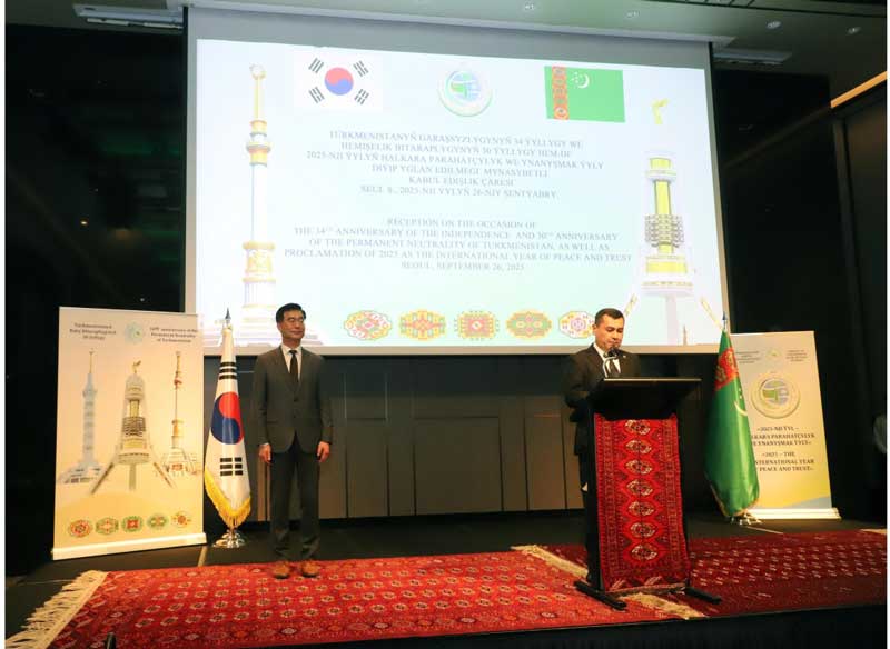26-njy sentýabrda Türkmenistanyň Koreýa Respublikasyndaky Ilçihanasynyň guramagynda Türkmenistanyň Garaşsyzlygynyň 34 ýyllygy, hemişelik Bitaraplygynyň şanly 30 ýyllygy hem-de 2025-nji ýylyň «Halkara parahatçylyk we ynanyşmak ýyly» diýlip yglan edilmegi mynasybetli Seul şäherindäki «Grand Hyatt» myhmanhanasynda dabaraly kabul edişlik geçirildi.