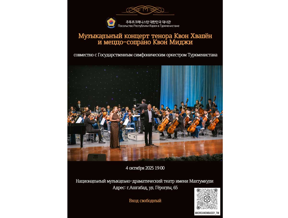 4 октября в 19:00 в Национальном музыкально-драматическом театре имени Махтумкули пройдет уникальный концерт с участием южнокорейских артистов — тенора Квон Хвапёна и меццо-сопрано Квон Миджи. Вдохновляющие и трогательные произведения классической музыки подарят слушателям незабываемые впечатления.