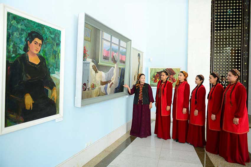 Посетители могут ознакомиться с такими полотнами мастеров живописи, как «Материнство» народного художника Туркменистана Якуба Аннанурова, «Сельская больница» и «Медсестра» заслуженного деятеля искусств Туркменистана Ниязмурата Доводова, «Чемпионка мира по самбо Гельдыбаева Дженнет», «Государственный гимн. Гульбадам Бабамурадова» Тамары Киселёвой, «Лекарь» Аннагельды Кулиева.