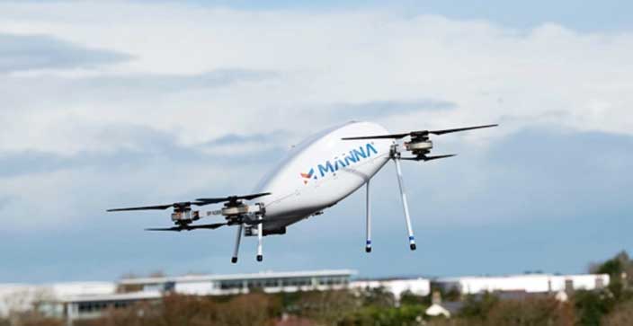 Irlandiýanyň «Manna Aero» kompaniýasy geljek ýyldan başlap, Angliýada azyk önümlerini dron bilen paýlamak hyzmatyny ýola goýar. Bu maksat bilen ýörite taýýarlanan agramy 23 kilogram bolan dronlar bilen häzire çenli Günbatar Dublinde, Finlýandiýanyň Espoo şäherinde we Tehasda jemi 200 müňden gowrak uçuş amala aşyrylypdyr. Bu dronlar 80 metre çenli belentlikden uçup, taýýar naharlar bilen bir hatarda azyk önümlerini hem bellenen salga äkidýär. Iýmit önümi salga eltilende ony uzakdan dolandyrýan işgär ýüp bilen aşakda duran müşderä sallaýar. Müşderi sargyt eden iýmitini ýüpüň ujundan alýar. Bu dron arkaly diňe gysga aralyga iýmit ugradylýar. Kompaniýanyň ýolbaşçysy Bobbi Holi kofeniň meşhurdygyny, emma has köp ýumurtga sargyt edilýändigini belledi.