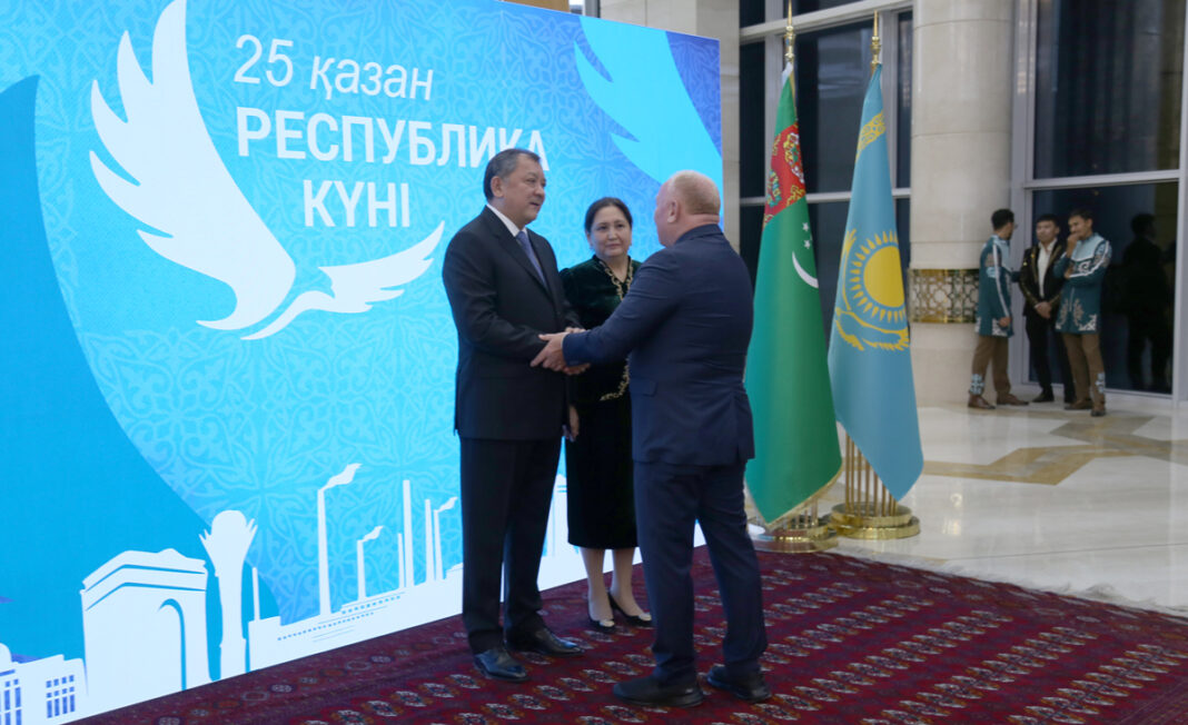 25-nji oktýabrda paýtagtymyzdaky “Ýyldyz” myhmanhanasynda Gazagystanyň Respublika Güni mynasybetli dabaraly kabul edişlik geçirildi. Gazagystan Respublikasynyň ýurdumyzdaky Adatdan daşary we Doly ygtyýarly Ilçisi Nogaýew we maşgalasy myhmanlary “Ýyldyz” myhmanhanasynyň girelgesinde garşylady. Dabarada Türkmenistanyň Hökümetiniň adyndan maliýe-ykdysadyýet pudagyna gözegçilik edýän wise-premýer Hojamyrat Geldimyradow gatnaşdy. Dabara ýurdumyzda akkreditirlenen diplomatik wekilhanalaryň hem-de halkara guramalaryň ýolbaşçylary, köpçülikleýin habar beriş serişdeleriniň agzalary we beýleki myhmanlar gatnaşdy.