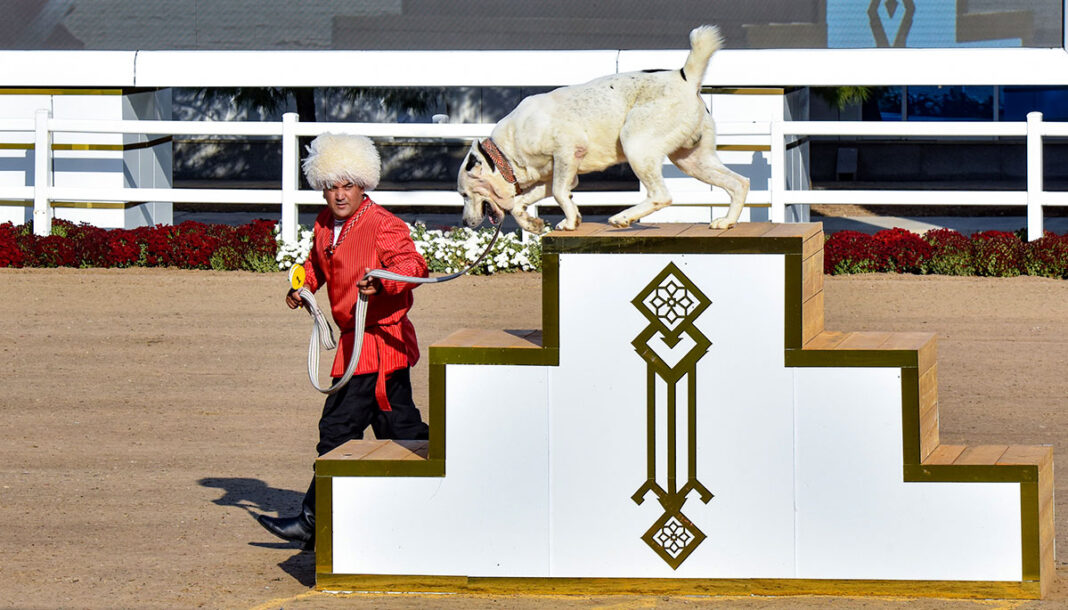 Soňra bäsleşige gatnaşdyrylýan alabaýlaryň görkezme çykyşlaryna orun berildi. Olar eýeleriniň öwreden endiklerini tomaşaçylara görkezdiler. Alabaýlaryň köp sanly janköýerleri olaryň ajaýyp daşky keşbi bilen birlikde, başarjaňlygyna hem baha berdiler. Olaryň öňünde anyk wezipeler, şol sanda päsgelçilikli zolaklary ýeňip geçmek wezipeleri goýuldy. Päsgelçiliklerden geçilende, tizlik we dürslük görkezijileri hasaba alynýar. Bu çekeleşikli görnüşler baýramçylyga aýratyn öwüşgin çaýdy.