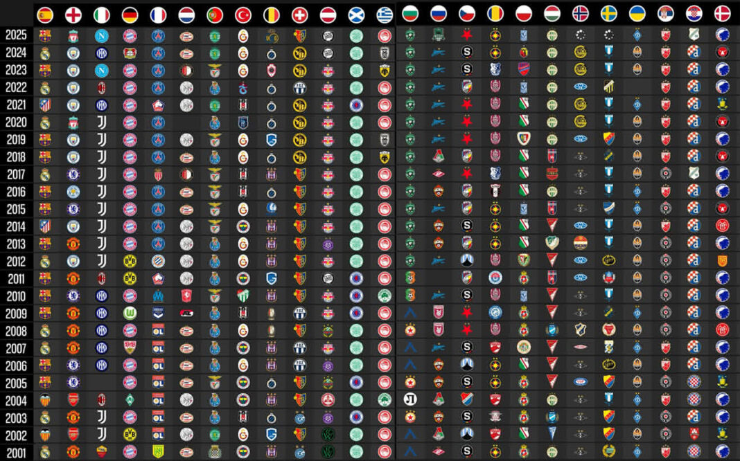 Futbolyň iň öňdebaryjy yklymy bolan Ýewropada soňky 25 ýylda, ýagny soňky çärýek asyrda näçe topar, şol sanda, haýsy toparlar çempionlyk gazandy? Tutuş yklymy hasaba alanyňda, diňe 2 klubuň gezekleşip ýa-da wagtal-wagtal 1 klubuň yzygiderlilikde çempionlyk gazanan ligalarynyň bolşy ýaly, milleniumdan soň 7-8, hatda 10 toparyň çempionlyk gazanan çempionatlary hem bar. Umumylykda, soňky 25 ýylda iň köp çempionlyk gazanan topar yklymyň iň kiçi ýurtlarynyň biri hasaplanýan Gibraltaryň “Linkoln Red Imps” topary bolup, olar 25 ýylda 22 çempionlyk gazanýar. Moldowanyň “Şerif” topary soňky 2 ýylda başga klublardan yzda galsa-da 25 möwsümiň 21-inde çempion bolýar. “Olimpiakos”, “Seltik”, “Dinamo Zagreb” 19 hem-de “Bawariýa” 18 gezek çempionlyga ýetýär.