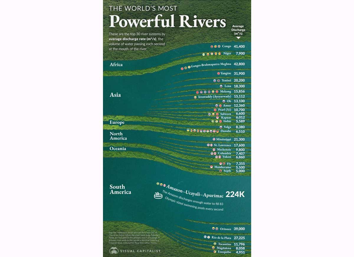 Derýalar Ýer togalagynyň arteriýalary bolup, olar süýji suwy yklymlara paýlaýar we tutuş ekoulgamy kemala getirýär. Täze infografikada ortaça akym tizligine görä saýlanan dünýäniň iň kuwwatly 30 sany derýasy hödürlenýär. Bu sanawda sekuntda 224 000 kub metr akym tizligi bilen Amazonka öňe saýlanýar. Ol ummana indiki görkeziljek dört äpet derýanyň tutuş suwundan hem köp suwy guýýar. Eger ony nasos hökmünde göz öňüne getirsek, ol her sekuntda 83 sany olimpiýa suw howdanyny dolduryp bilerdi.