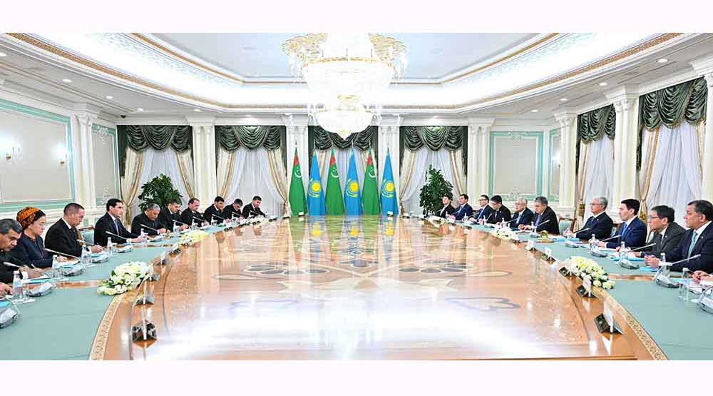 Prezidentler Serdar Berdimuhamedow bilen Kasym-Žomart Tokaýewiň arasynda iki halka mahsus açyklyk, birek-birege düşünişmek hem-de özara ynanyşmak ýagdaýynda geçirilen gepleşikleriň dowamynda däp bolan türkmen-gazak gatnaşyklaryny mundan beýläk-de hemmetaraplaýyn ösdürmek bilen bagly meseleler ara alnyp maslahatlaşyldy. Soňra gepleşikler iki ýurduň resmi wekiliýetleriniň gatnaşmagynda giňeldilen düzümde dowam etdi.