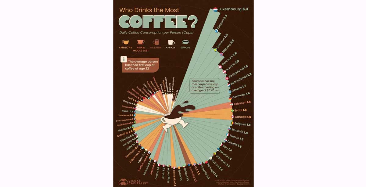 Demirgazyk Ýewropa kofe garaşlylygynyň global merkezi bolmagynda galýar. Lýuksemburg her adam başyna günde 5,31 çaşka kofe bilen dünýä sanawynda birinji orny eýeläp, ykdysadyýeti güýçli ýurtlardan ep-esli öňe saýlanýar.