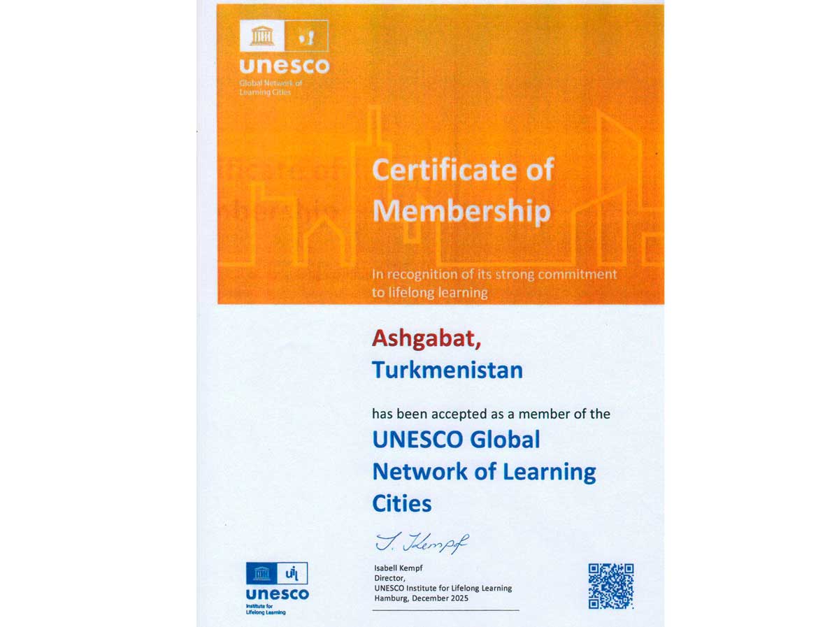 Mälim bolşy ýaly, şu ýylyň 4-nji dekabrynda ýurdumyzyň ylym we bilim ulgamyny ösdürmekde gazanan ýokary netijeleri, ähli ýaşdaky raýatlaryň ömrüniň bütin dowamynda okamagy hem-de bilimleri özleşdirmegi üçin zerur şertleri döreden Aşgabat şäheri dünýäniň 46 ýurdunyň 72 şäheriniň hatarynda ÝUNESKO-nyň öwreniji şäherleriniň bütindünýä toruna girizildi. Bu çözgüt Türkmenistanyň paýtagtynyň ylym-bilimi ösdürmekde, ähli ýaşdaky raýatlaryň ömrüniň tutuş dowamynda okamagy babatda zerur şertleri döretmekde ýokary netijeleri gazanandygynyň ykrarnamasy boldy.