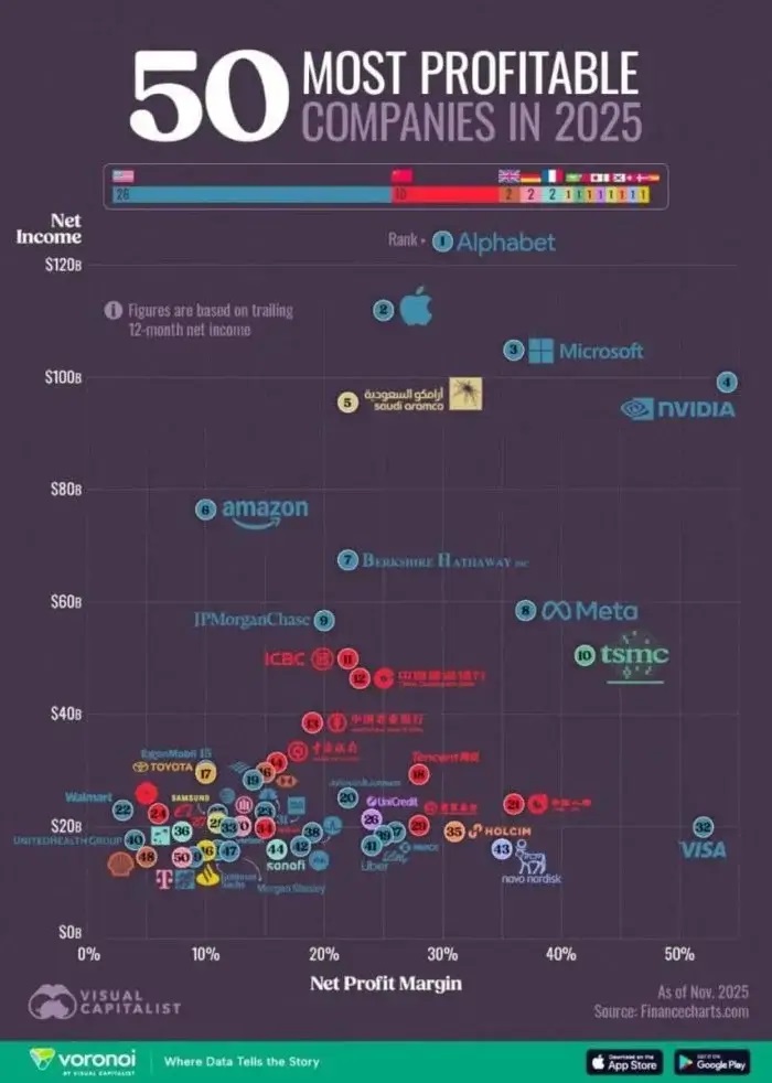 Bu infografika üçin maglumatlar “FinanceCharts” tarapyndan berilýär. Olar 2025-nji ýylyň noýabr aýyndaky ýagdaý boýunça kompaniýalaryň soňky 12 aýdaky sap girdejisini, şeýle hem bu netijeleriň esasyndaky girdejililigi görkezýär.