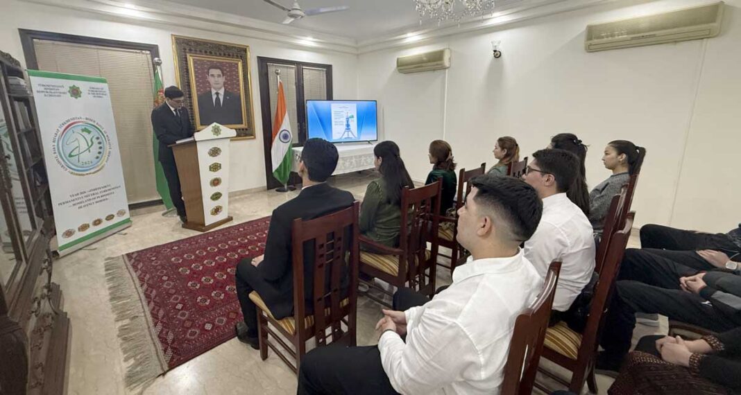 6-njy fewralda Türkmenistanyň Hindistan Respublikasyndaky Ilçihanasynda Türkmenistanyň Hormatly Prezidenti Serdar Berdimuhamedowyň «Türkmenistanyň Bitaraplygy – parahatçylygyň we ynanyşmagyň aýdyň ýoly» atly täze kitabynyň tanyşdyrylyş dabarasy hem-de 2026-njy ýylyň şygarynyň “Garaşsyz, baky Bitarap Türkmenistan — bedew batly at-myradyň mekany» ýyly diýip yglan edilmegi mynasybetli çäre geçirildi.