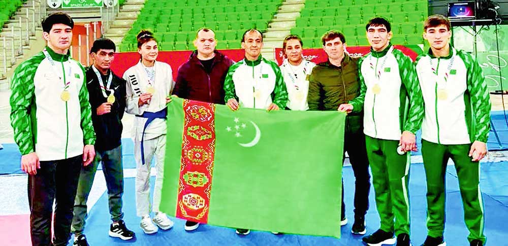 The national jiu-jitsu team of Turkmenistan performed successfully at the international tournament held recently in Genoa, Italy. They won 7 gold medals, 6 silver medals, and 5 bronze medals.