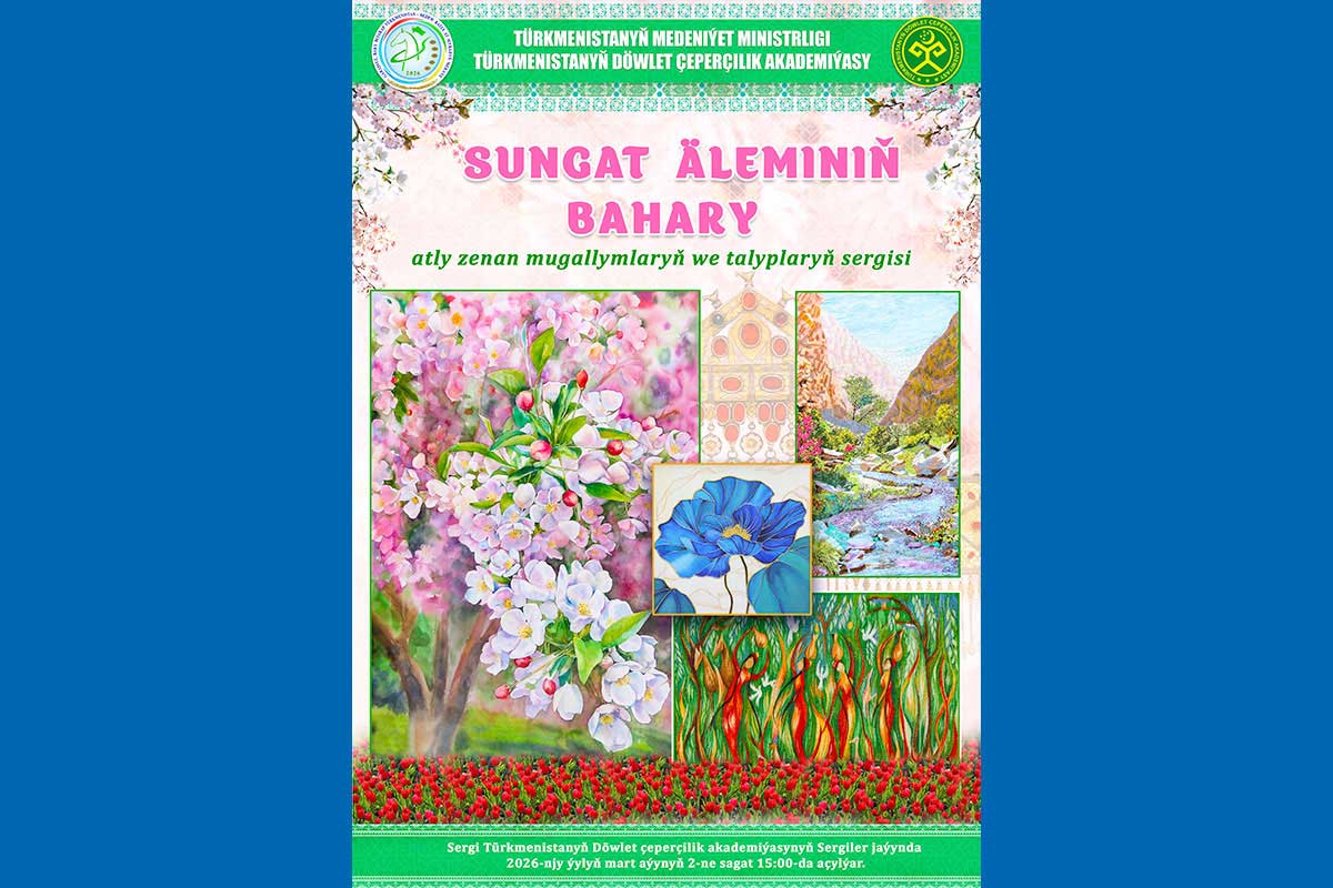 Mart aýynyň 2-sine sagat 15:00-da Türkmenistanyň Döwlet çeperçilik akademiýasynyň Sergiler jaýynda «Sungat äleminiň bahary» atly zenan mugallymlaryň we talyp ýaşlaryň sergisi açylýar.