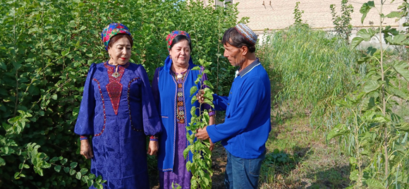 Suratda: Türkmenistanyň Tebigaty Goramak jemgyýetiniň Lebap welaýat bölüminiň bagbanlary Rozymurat Saparow, Miwe Araşowa dagy nahalhanamyzda işläp oturan pursatlary hem-de jemgyýetiň hünärmeni Rejepgül Huddyýewa bilen bagbanlaryň maslahat edýän pursatlary.
