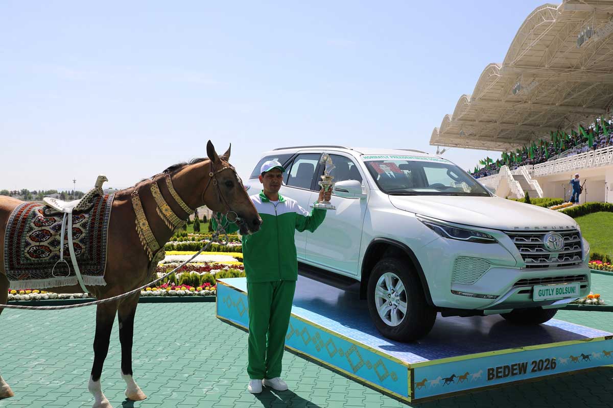 «2026-njy ýylyň iň owadan ahalteke bedewi» diýen ada Hankerwen atly ahalteke bedewi mynasyp boldy. Halkara gözellik bäsleşiginiň ýeňijisi bolan atyň eýesi bolan Türkmenistanyň Prezidentiniň Ahalteke atçylyk toplumy hünärmeni, Arkadag şäheriniň ýaşaýjysy Myratgeldi Mämmedowa hormatly Prezidentimiz Serdar Berdimuhamedowyň baş baýragy – «Toyota Fortune» kysymly täze awtoulagyň açary, göçme kubok hem-de diplom gowşuryldy.