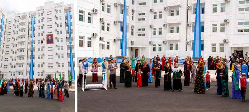 Täze jaýyň öňündäki dürli şarlar, köpöwüşginli çykyşlar bilen bezelen meýdança paýtagtymyzyň we şäheriň etraplarynyň häkimlikleriniň wekilleri, hormatly ýaşulular, kümüş saçly eneler, ýaşlar we Aşgabat şäheriniň köpsanly ýaşaýjylary, myhmanlary hem-de köpçülikleýin habar beriş serişdeleriniň wekilleri ýygnandylar.