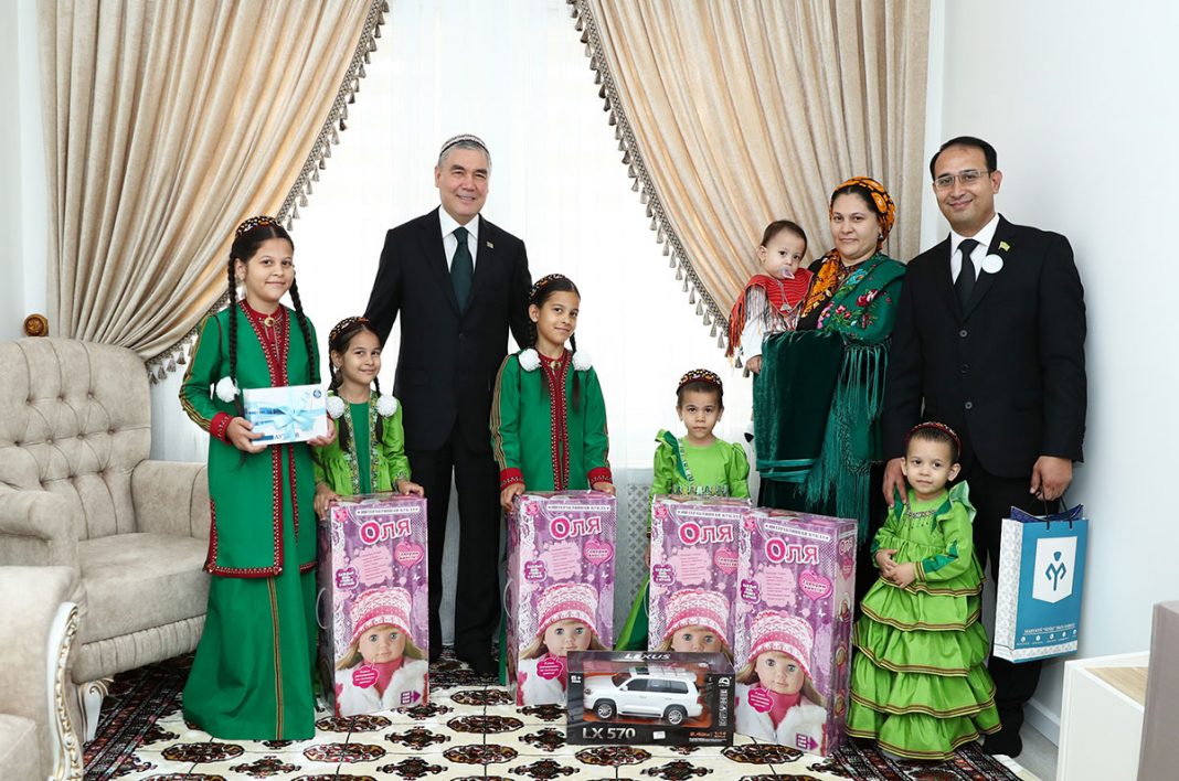 Gahryman Arkadagymyz täze jaýa göçüp gelmek bagty miýesser eden maşgalany goşa toý bilen gutlady we öýüň otaglarynyň ýerleşdirilişi, olaryň enjamlaşdyrylyş derejesi, aşhanasynyň aýratynlyklary bilen tanyşdy.