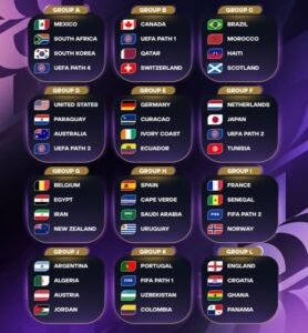 “D” toparçada ýer eýesi ABŞ-nyň milli topary Awstraliýadyr Paragwaýyň, şol sanda Ýewropadan gatnaşjak UEFA Pleý-off C ýolunyň (Türkiýe – Rumyniýa / Kosowo – Slowakiýa) ýeňijisi bilen özara güýç synanyşar. “E” toparçany Germaniýanyň, Ekwadoryň, Kot-d’Iwuaryň hem-de çempionatyň debýutanty Kýurasaonyň ýygyndylary düzdüler. “F” toparçada Niderlandlaryň, Ýaponiýanyň, Tunisiň ýygyndylary hem-de UEFA Pleý-off B ýolunyň (Şwesiýa – Ukraina / Albaniýa – Polşa) ýeňijisi bilen duşuşarlar.