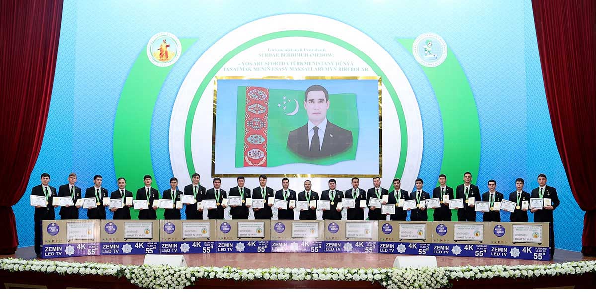 Dabara gatnaşyjylaryň şowhunly el çarpyşmalary astynda türgenlere diplomlar hem-de döwlet Baştutanymyzyň adyndan ýadygärlik sowgatlar gowşuryldy.
