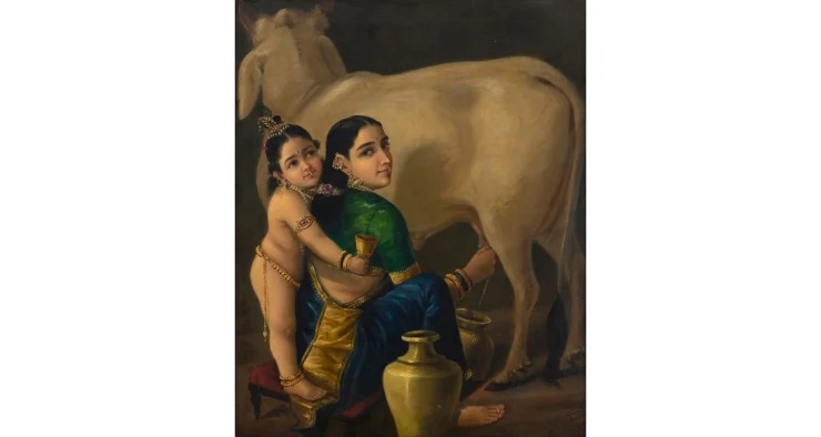 The artist is widely known in the country for his modern depictions of scenes from Hindu epics and mythology. The artwork “Yashoda and Krishna,” created in the 1890s, depicts a memory of the Hindu god Krishna’s childhood with his stepmother, Yashoda. Yashoda is milking a cow while Krishna stands beside her with a cup.
