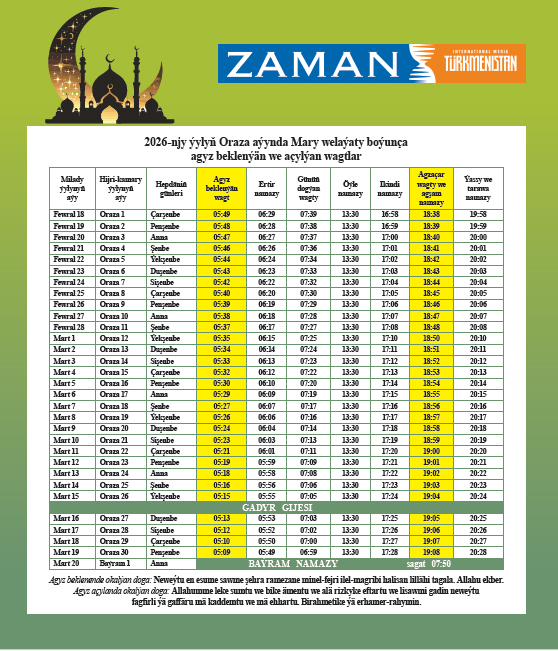 Esasy Oraza Mary welaýaty Mary welaýaty 2026-02-13 7181 MARY_ORAZA_KALENDAR_2026 Gyzykly bolup bilerЕЩЕ ОТ АВТОРА Oraza Aşgabat şäheri we Ahal welaýaty Oraza Lebap welaýaty Oraza Daşoguz welaýaty Oraza Balkan welaýaty